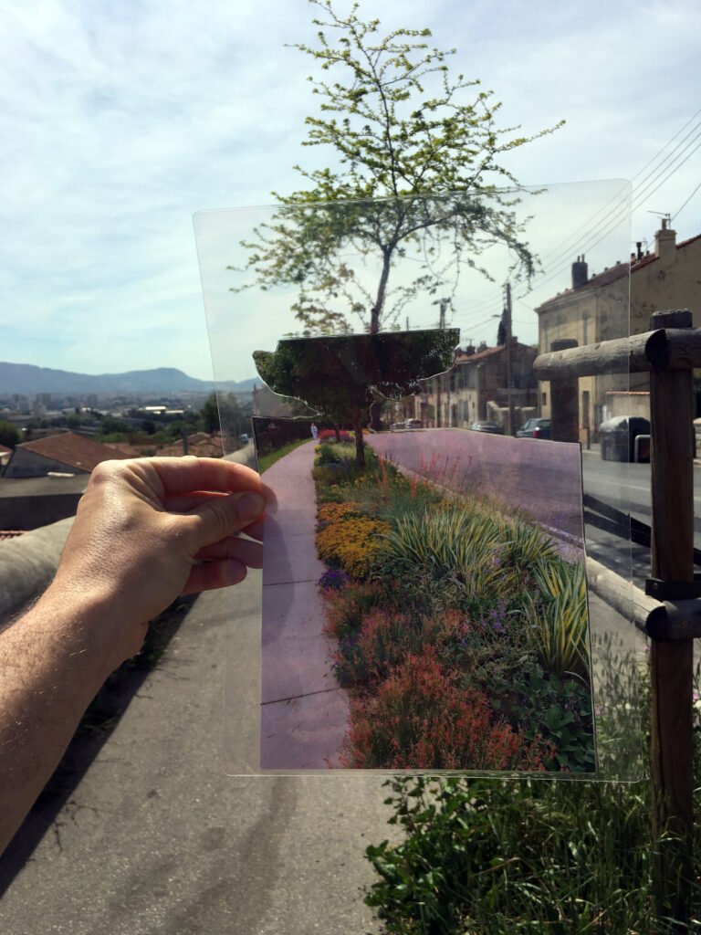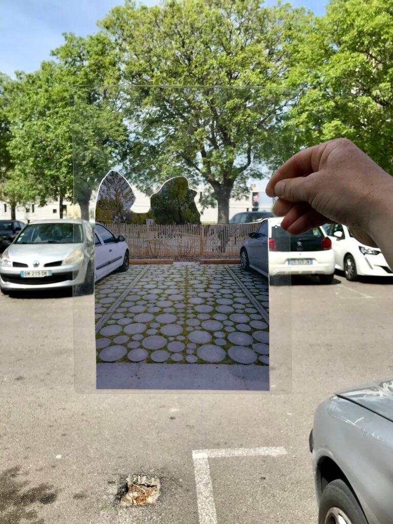 Chaque participant·e reçoit un livret d’exploration à compléter pendant la marche, ainsi que des images de référence d’aménagements urbains sur transparents, que l’on va chercher à superposer au réel, tel des photomontages artisanaux.