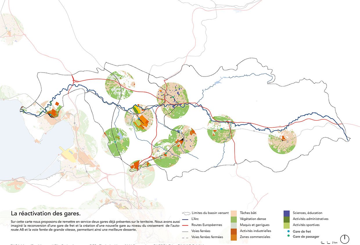 “Dans le cadre du studio de projet, la vallée de l’Arc a constitué pendant un an notre site-laboratoire. 83 kilomètres de longueur entre Pourrières (Var) et Berre l’Etang (Bouches-du-Rhône), 35 affluents, 16 communes traversées et autant de situations à analyser, révéler, magnifier, changer, développer, etc. Il s’est agi, par un travail de révélation, de construire la biorégion urbaine de l’Arc, à l’instar de celle de l’Arno développée par Alberto Magnaghi. Cela nous a permis de poser les jalons d’un système vertueux, dans lequel les modes d’occupation des espaces contigus au fleuve étaient pensés comme les parties d’un tout.