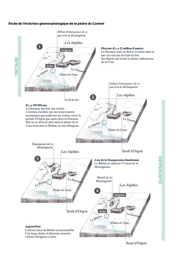 Suite aux études cartographiques du socle géologique et hydrologique menées sur ce territoire, il nous est apparu la présence d’un paléotracé du Rhône dans cette plaine au temps de l’Holocène (environ -10 000 ans avant notre ère). De Arles à Avignon, le projet de sentier veut ainsi remonter le cours d’un ancien sillon du Rhône et mettre en récit ses paysages anciennement irrigués. Pour imaginer un projet de sentier, nous sommes partis à la découverte des interstices du territoire pour révéler des angles morts, les entre-deux, les périphéries ou les résidus que l’aménagement n’a pas pensé. Après un premier repérage cartographique nous avons divisé notre cheminement en quatre tronçons d’environ dix kilomètres afin de marcher dans le talweg encore visible par une végétation plus humide et des terres moins praticables pour l’agriculture. Nous nous sommes vite aperçu des freins à notre déambulation : privatisation des espaces, canaux et friches infranchissables, etc… Dans ce sens, la pratique de terrain est la seule permettant de suggérer les limites, les horizons et les spécificités des lieux. Nous avons donc imaginé ce projet de sentier comme une approche culturelle de (re)découverte d’une plaine qui ne semble plus parcourue. L’objectif était ici de retrouver, par la marche, une pratique à taille humaine pour comprendre les dynamiques actuelles : pratiques agricoles, rapports à l’eau, topographie, dynamique hydrologique, dispositifs paysagers d’adaptation au climat…